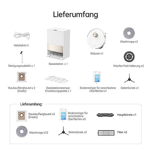 Das Paket beinhaltet ein Zubehörset, bestehend aus Staubauffangbeutel, Bodenreiniger für verschiedene Oberflächen, Wischer-Pads, Haupt- und Seitenbürsten, Filtern sowie die Basisstation und den Robotersauger. Zudem enthält das Paket eine Basisstationsrampe-Erweiterungsplatte, ein Netzkabel und Reinigungszubehör.