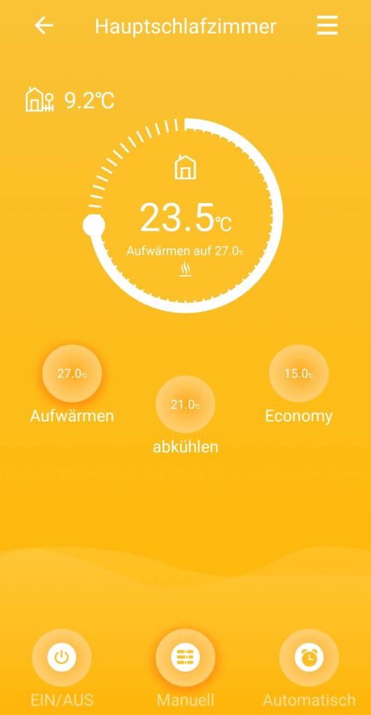 Hier kannst du die Temperatur einstellen und unten zwischen den Modi wechseln. "Manuell" bedeutet, dass deine eingestellte Temperatur beibehalten wird und bei "Automatisch" übernimmt dein Heizplan die Steuerung. Außerdem kannst du den aktuellen Temperatur-Modus wählen - "Aufwärmen", "Abkühlen" oder "Economy". Dann wird das System auf die dort konfigurierten Temperaturen eingestellt. Wenn du diese Temperaturen ändern möchtest, tippe open rechts auf das Hamburger-Menü (die drei waagrechten Striche).