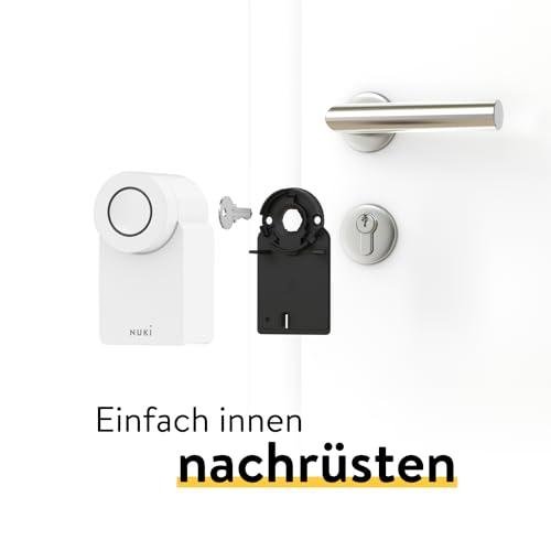 Das Nuki Smart Lock 4.0 ist als elektronisches Türschloss konzipiert, das sich in unter drei Minuten einfach an deiner Eingangstür nachrüsten lässt. Die Installation erfolgt auf der Türinnenseite über deinem bestehenden Türschloss - ganz ohne Bohren und Schrauben. Von außen ist es völlig unsichtbar. Und das Beste? Es kann auch wieder rückstandslos entfernt werden. Bevor du loslegst, prüfe bitte auf der Nuki-Webseite, ob Nuki an deine Tür passt.