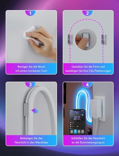 Mit 64 Szenenmodi, 11 Musikmodi und der Möglichkeit, aus 16 Millionen Farben zu wählen, sind deiner Kreativität keine Grenzen gesetzt. Du kannst den LED-Streifen auch mit anderen Govee Smart Lights gruppieren und so das perfekte Beleuchtungserlebnis für dein Zuhause schaffen. Und dank der mitgelieferten 20 Clips ist die Befestigung an der Wand ein Kinderspiel.