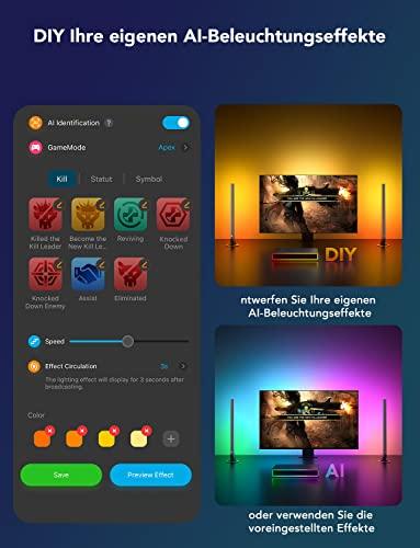 Dank der AI-Beleuchtung, die auf bestimmte Spielaktionen reagiert, bietet die Govee AI Sync Box ein unvergleichliches Beleuchtungserlebnis. Die fortschrittliche algorithmische Analyse erkennt Aktionen und Ereignisse im Spiel, wie die Auswahl von Charakteren oder die Verwendung von Gegenständen, und passt die Beleuchtung entsprechend an. Bitte beachte, dass diese Funktion nur die englische Gaming-Oberfläche unterstützt.